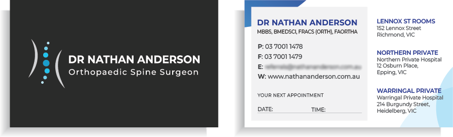 Simultaneously with the website’s development, we began designing the client’s business stationery, focusing initially on business cards and letterhead. Typically, we present two comprehensive business card designs, allowing the client to select and customise their preferred option based on their package. In this case, we also designed a number of letterheads for various purposes including a version to be incorporated into the client’s Practice software, and then a design for a A5 flip pad which we organised to be printed along with the business cards (note we are not printers – we use a third party service for this).